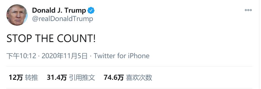 眼见于此,特朗普不禁有些“慌了”,甚至直接在推特上呼吁“停止计票”。