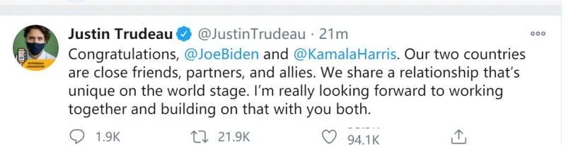 反应最快的就是加拿大总理特鲁多,他在推特上祝贺道:“祝贺拜登和哈里斯,加美两国是亲密的朋友、伙伴及盟友,我们有着独一无二的关系。我很期待和你们一起合作,并取得进展。”