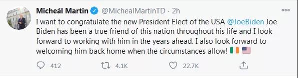 爱尔兰总理米歇尔·马丁也发推称:“拜登是爱尔兰真正的朋友,我期待着在未来与他合作。欢迎他在条件允许的时候回家看看!”