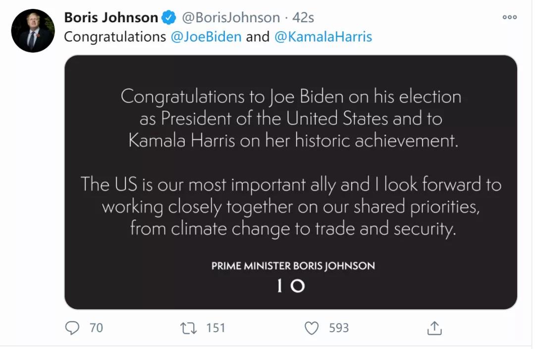 而英国首相鲍里斯也发推表示了祝贺,值得注意是,这位此前一直被称为“英国特朗普”的首相只写了一句话:“祝贺拜登和哈里斯”。