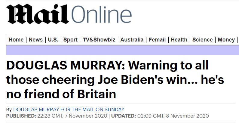 英国保守派作家Douglas Murray也在DM上撰文称,拜登不是英国人民的朋友,你们不必为他的获胜欢心鼓舞。