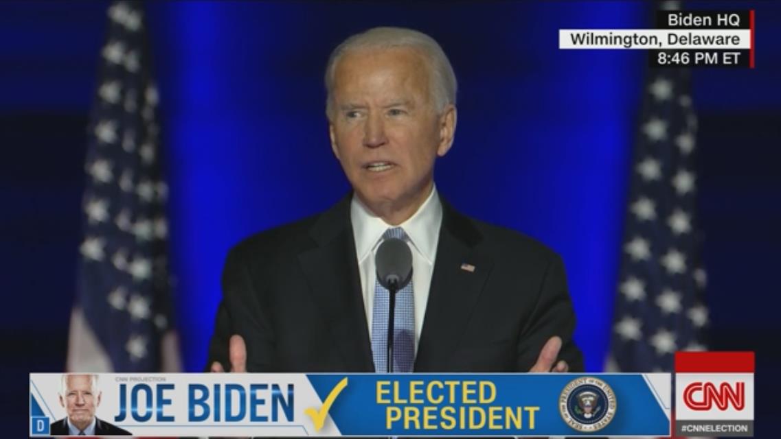 随后,拜登就在他的家乡特拉华州威明顿市发表了胜选演讲,在讲话中,拜登首先宣布了自己的胜利。