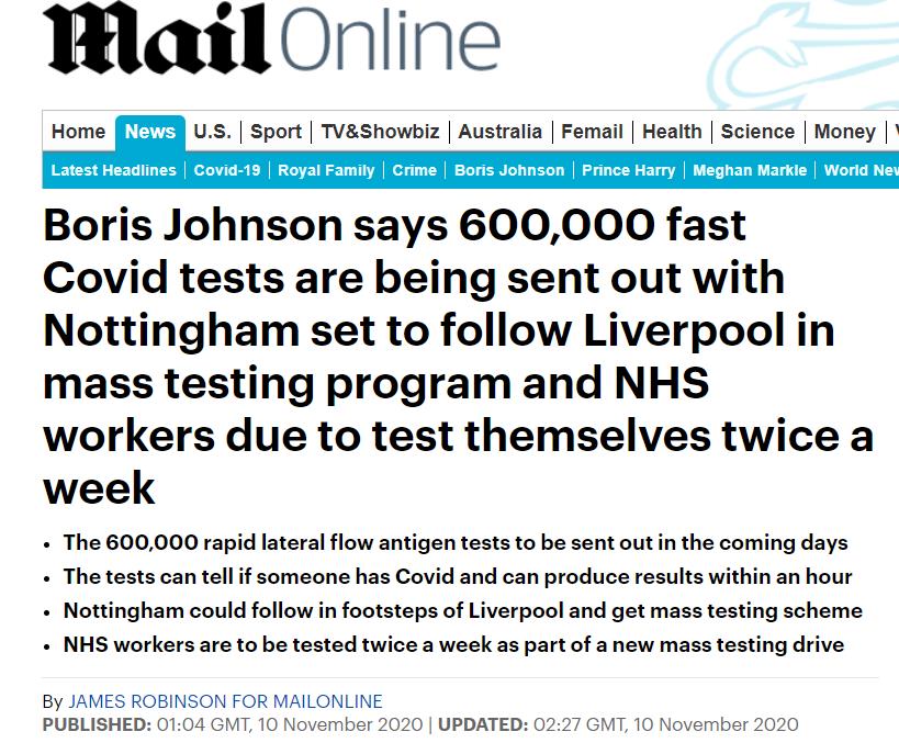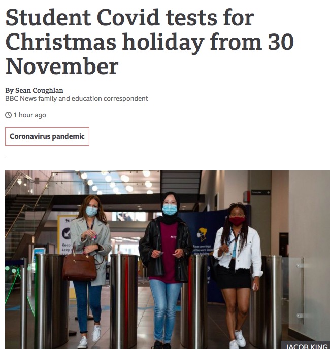 “为了使大学生能够平安回家过圣诞节,11月30日起至12月6日期间,在英格兰对大学生进行大规模检测。”