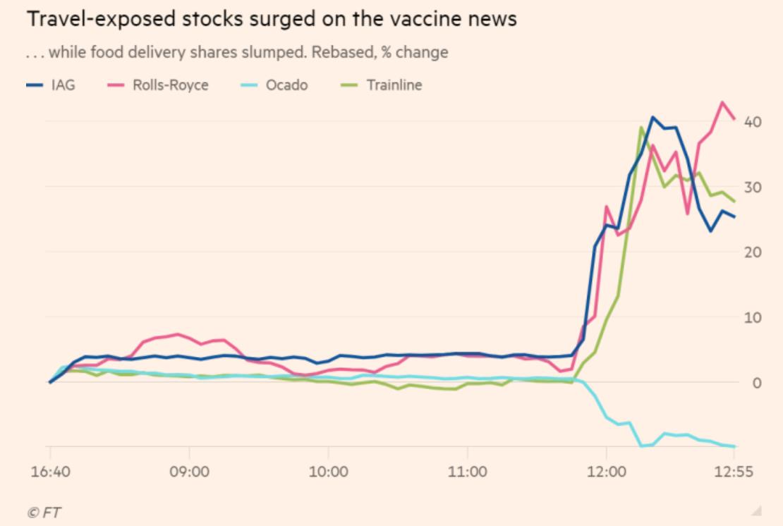 一时间,疫苗迅速问世的希望大增,加之拜登此前在美国大选中取得胜利带来的利好消息,促使全球股市在周一大涨,尤其是受疫情打击最严重的企业,领涨了股市。