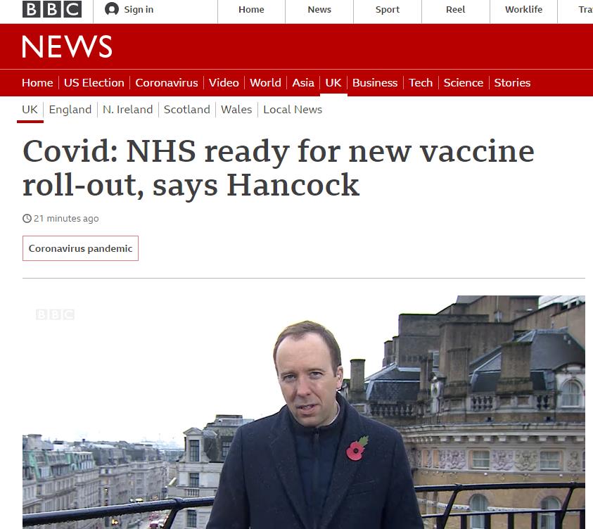 随后,在今天的BBC节目中,英国卫生大臣马特·汉考克也证实了这一消息,并表示,NHS和军队已经做好接种疫苗的准备,英国政府也已投入额外的1.5亿英镑来推广这项服务。