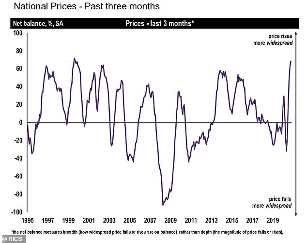 RICS的数据显示,有68%的受访者认为过去三个月内房价出现了上涨,这是自1999年9月以来的最高值。