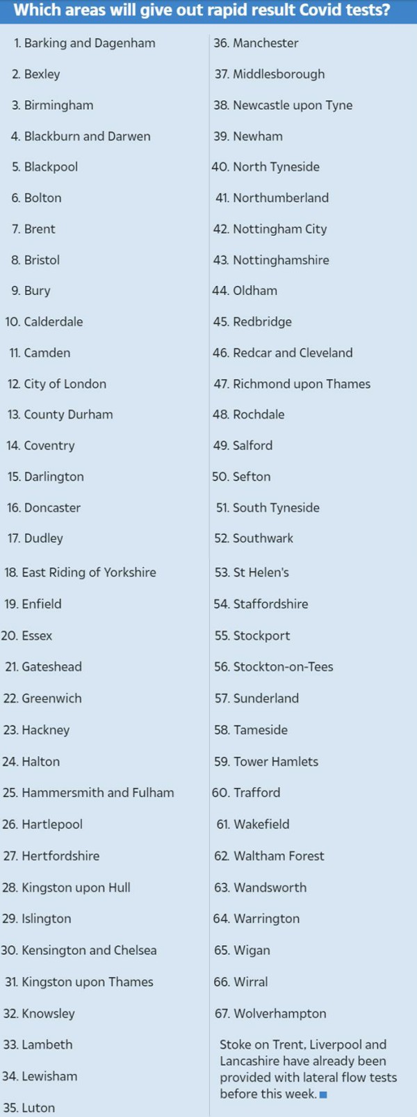 英国政府预计初步将发放60万份快速测试包,所覆盖地区的名单如下图所示。