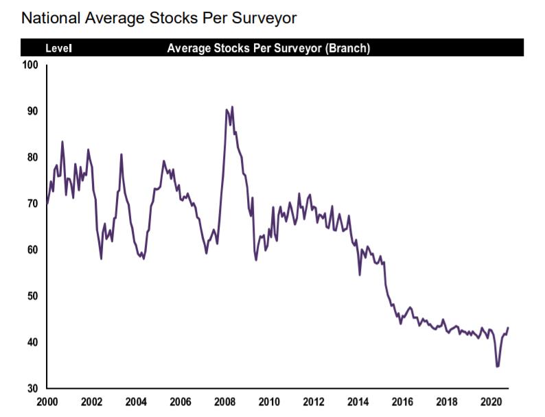 不过,买家可挑选的房产数并不多,10月份各家中介公司的平均房产库存水平从34套降至了33套。