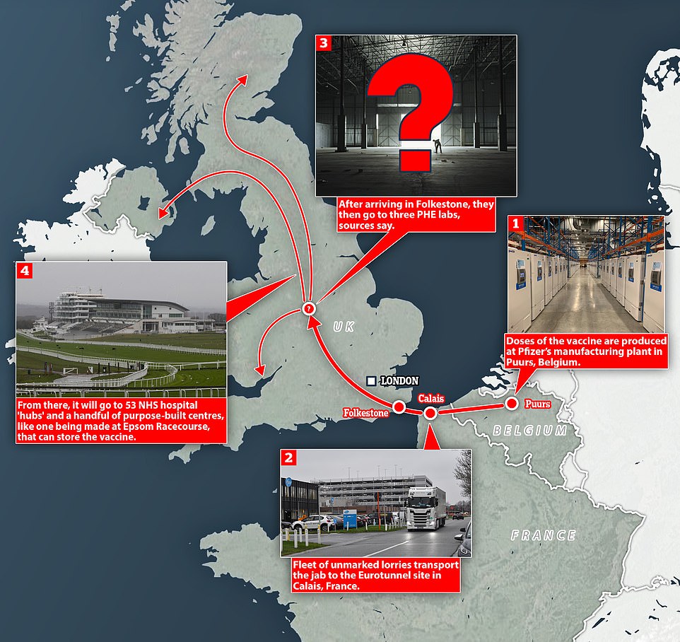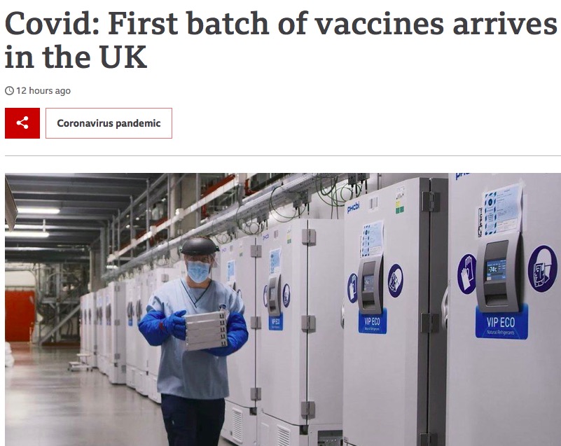 - 第一批辉瑞疫苗从比利时辉瑞工厂抵达英国,这批疫苗现在将被分发到全国各地的医院疫苗接种中心。