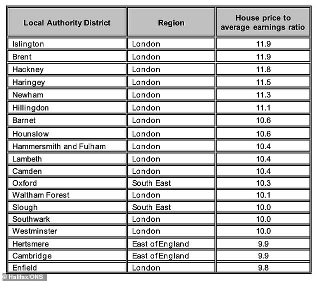 如下图所示,平均房价和平均收入比,位于伦敦的Islington是英国最难以负担的地区。