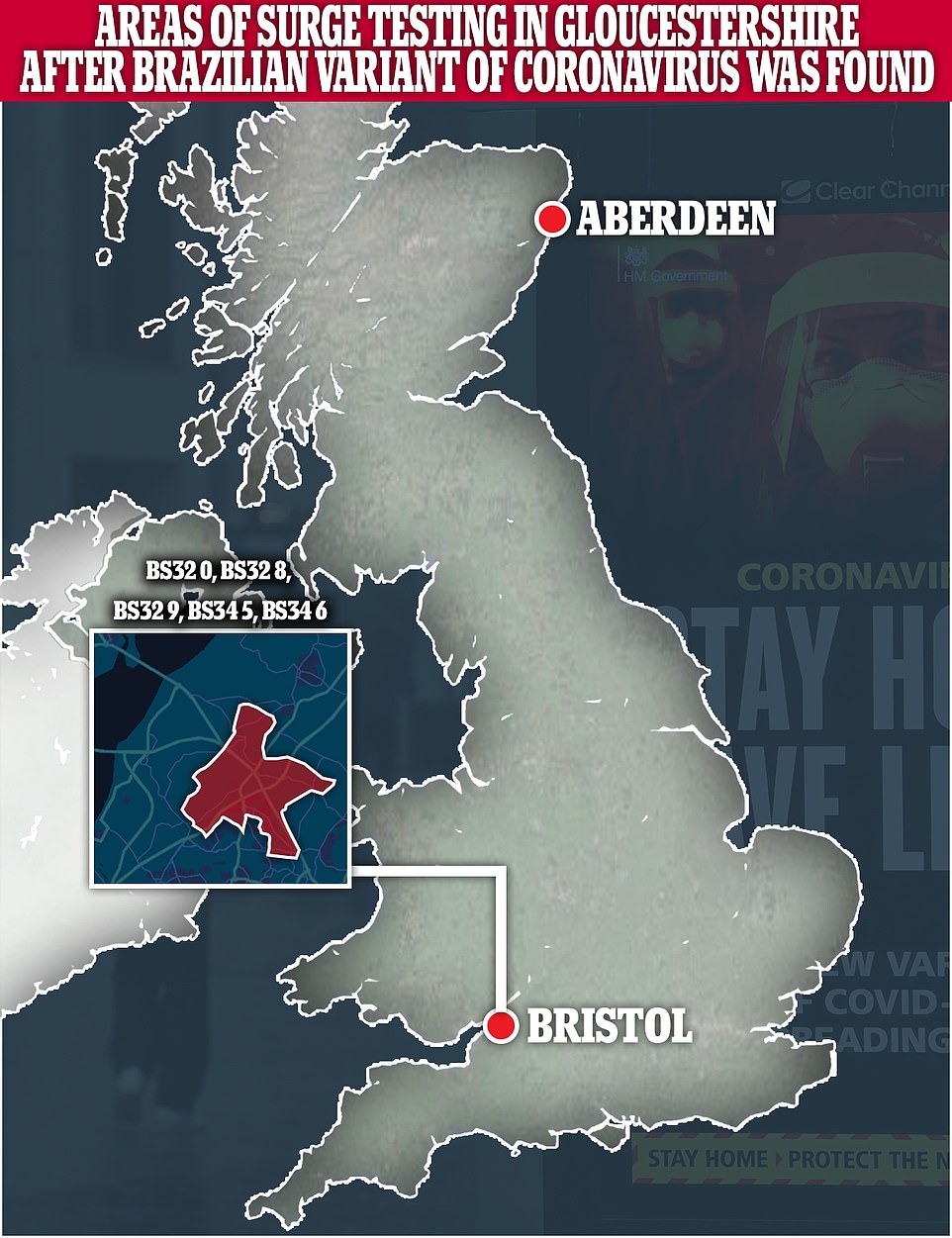 在英格兰,前两例感染了变异毒株的患者来自南格洛斯特郡的同一户家庭。2月10日,也就是政府强制酒店隔离政策实施的5天之前,这家人中有人从巴西返回英国。除了2人确诊感染巴西变异毒株之外,这家人还有另外2人确诊感染了新冠,但尚不明确是否也是变异毒株。