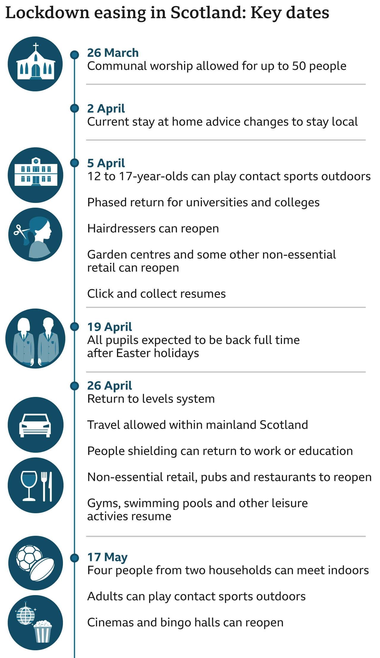 在4月26日取消苏格兰境内的旅行禁令之前,人们仍必须呆在当地。同一天,所有商店、健身房和游客住宿场所以及一些室内接待场所也将重新开放。