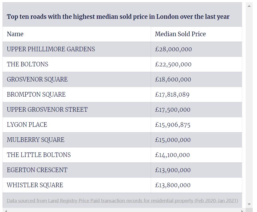 根据报告,位于肯辛顿&切尔西的UpperPhillimore Gardens被评为2020年伦敦最贵的街道,去年的房屋售价中值(mediansale price)为2,800万英镑。