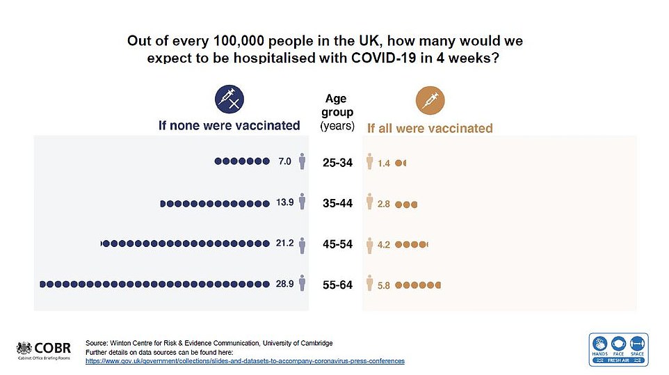 根据预测,如果人们都接种了疫苗,四周后,在25-34岁的年龄段,每10万人中平均有1.4人会因新冠住院,不接种疫苗的住院率为每10万人7人住院。