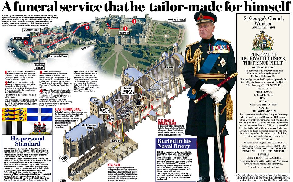 在葬礼当天下午2点40,菲利普亲王的棺木将乘坐一辆他参与设计的经过特殊改装的路虎车从温莎城堡运到圣乔治教堂。包括查尔斯王子在内的王室成员将走在灵车后面,女王将分别前往教堂。所有参与葬礼的人员将保持社交距离,并佩戴口罩。游行将持续8分钟,期间军方将鸣枪,钟声将敲响。最终宾客名单将于周四公布。亲王的灵柩将被放在温莎城堡的私人教堂里,并将悬挂公爵的个人旗帜,在顶端放上鲜花花环。