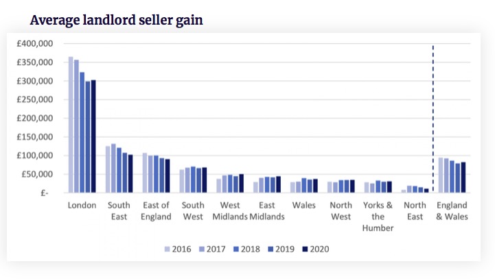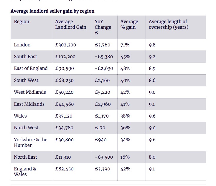 伦敦的房东以平均£302,200 的价格出售了他们购房出租的房产,比他们当初买房时的价格高出了71%,平均拥有房产的时间为9.8年。去年,他们的平均毛利润也有所增加。
