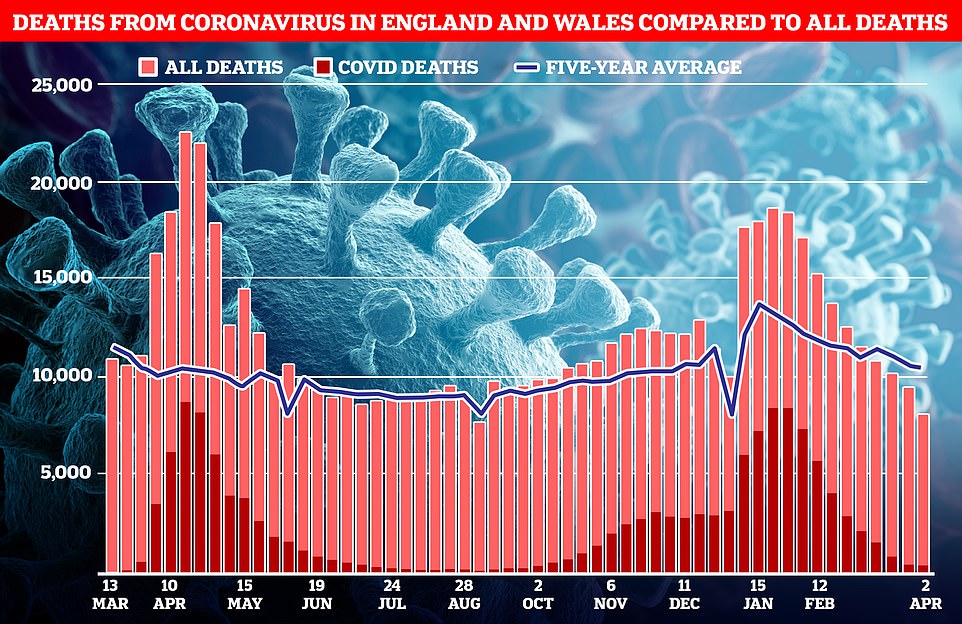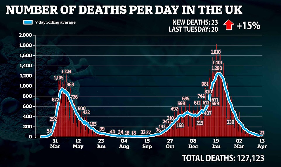如下图所示:在最近的4月2日这一周有400例死亡与新冠有关。相比之下,这是10月2日以来的最低水平。