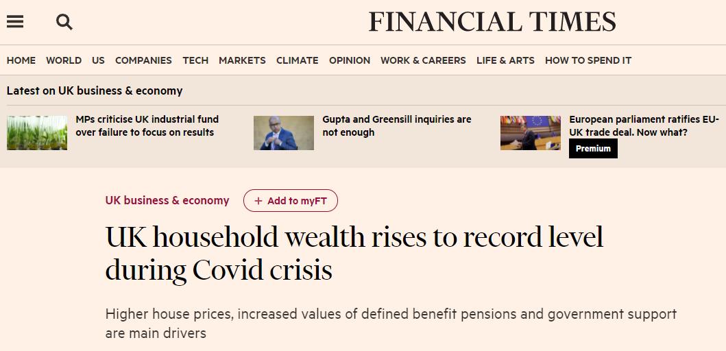 然而,随着疫情的好转,英国经济走上了快速复苏之路,且最新官方数据显示,英国家庭的净财富已经跃升至创纪录的水平!