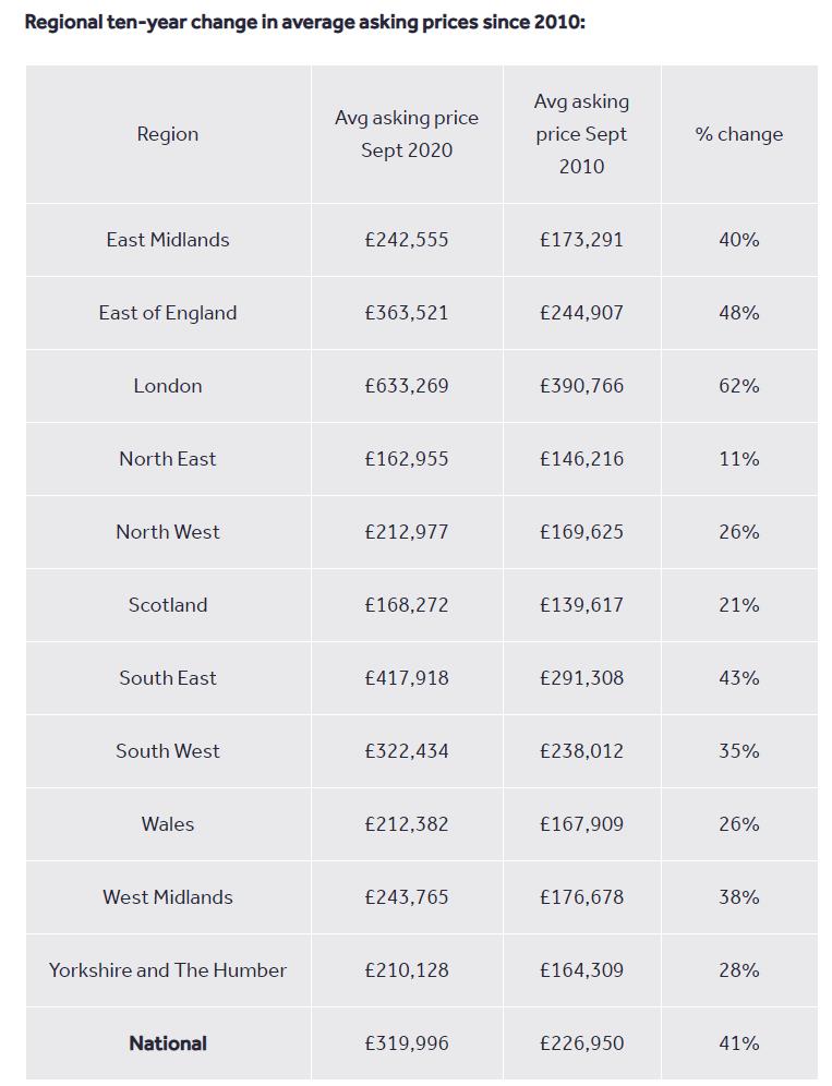 根据Rightmove此前公布的10年期房价数据,过去10年,英国平均房屋要价上涨了9.3万英镑,涨幅41%。