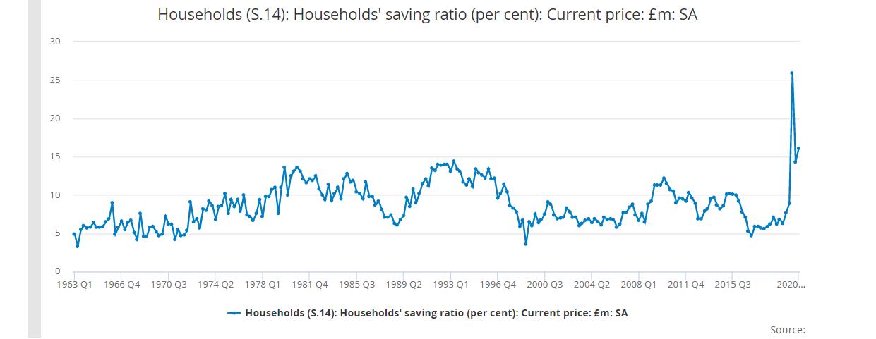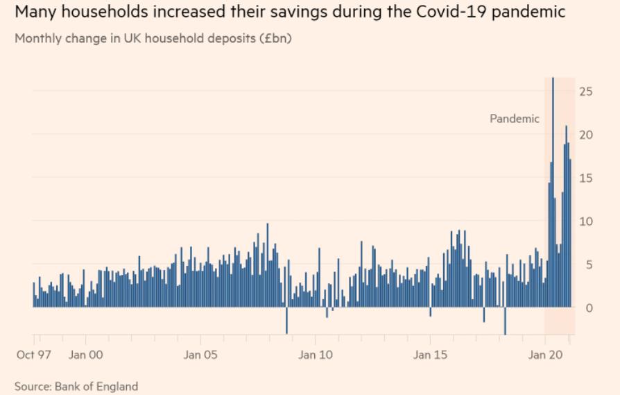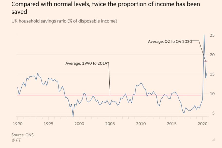 在整个疫情期间,英国家庭的储蓄率也出现了大幅上升,截至去年年底,英国的储蓄率为15.6%,远高于约9%的正常水平。