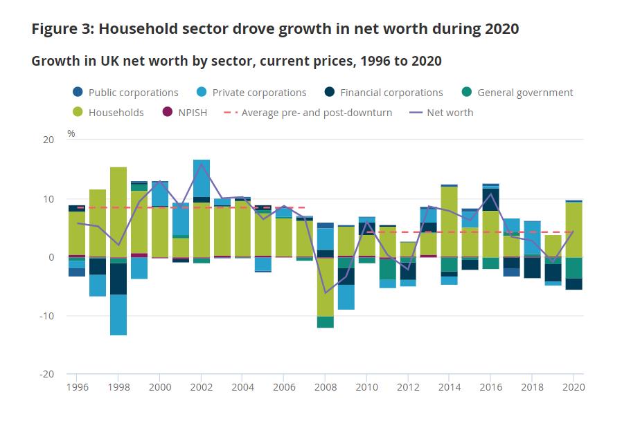 据英国国家统计局ONS的数据显示,在2019至2020年间,英国家庭资产净值增长了9.1%,达到11.4万亿英镑,增幅接近1万亿英镑。