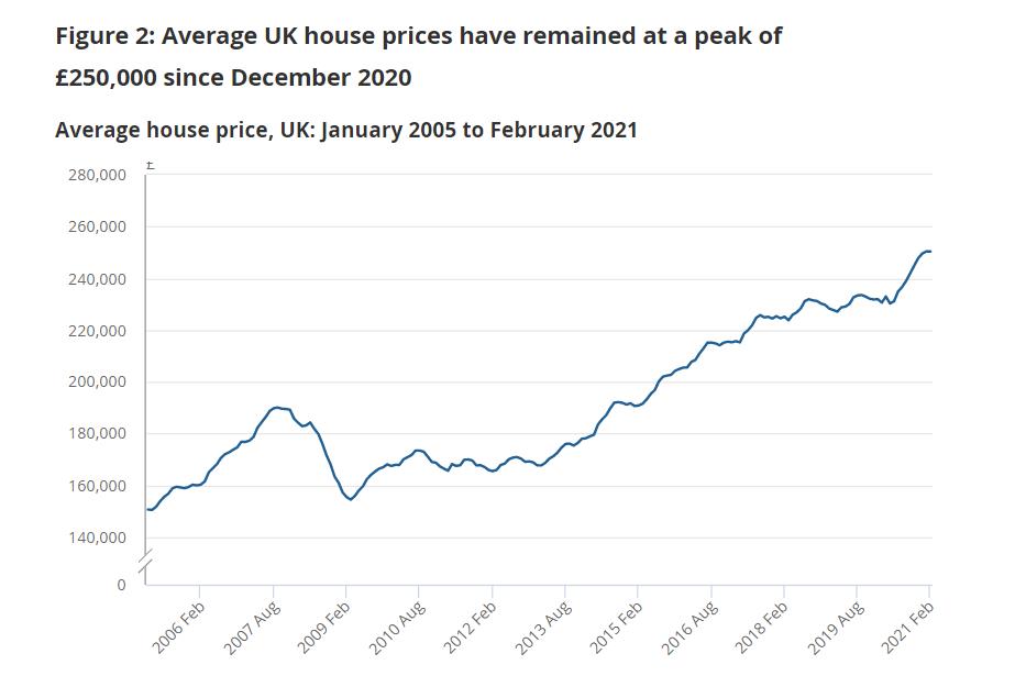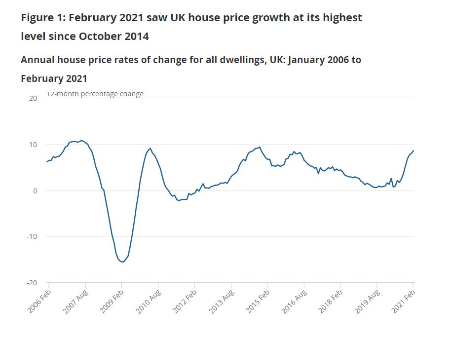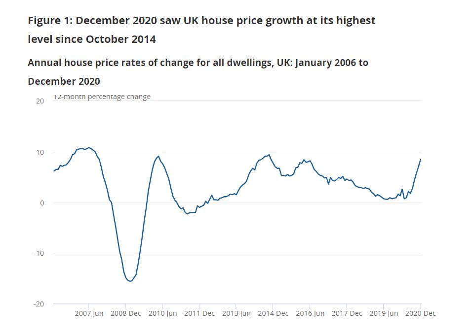 ONS数据显示,在截至2021年2月的一年里,英国平均房价上涨了8.6%,再次刷新了去年的记录。