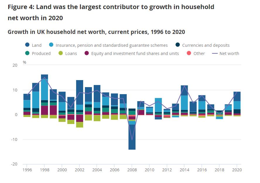 而仅靠房产增值一项,英国家庭净财富在过去一年就增长了3.8%。房价上涨也成为了对家庭净财富贡献最大的一个因素。