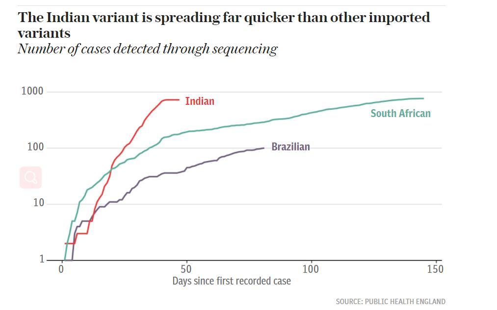 此外,《The Telegraph》的监测数据认为,印度变种的传播速度是其他在英国境外发现的变种病毒的三倍。