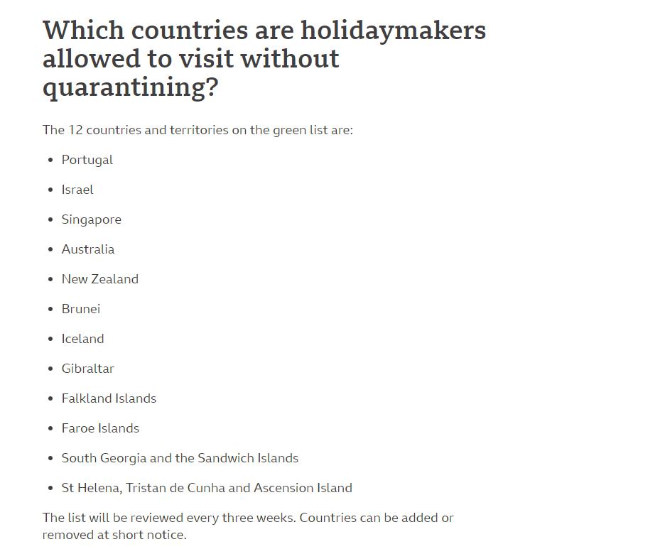 本周一,英国将正式开放国家旅行,根据最新规定,游客在前往政府“绿色名单”上的12个国家并返回英国后不需要自我隔离。