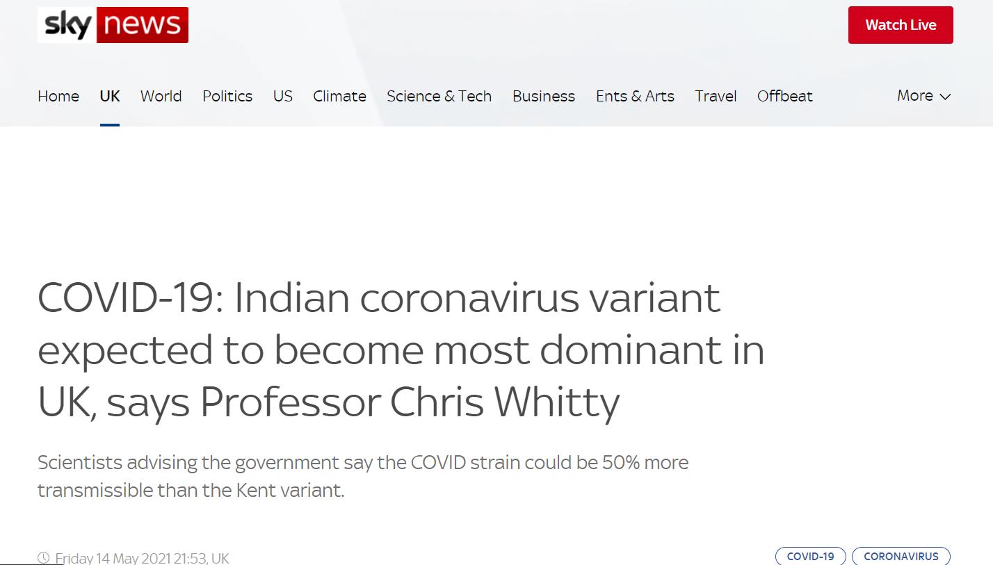 面对病例数的激增,英国首席医疗官克里斯·惠蒂(Chris Whitty )教授日前也承认,随着时间推移,印度变种有可能会取代之前的肯特变种,成为英国境内主要传播的病毒。