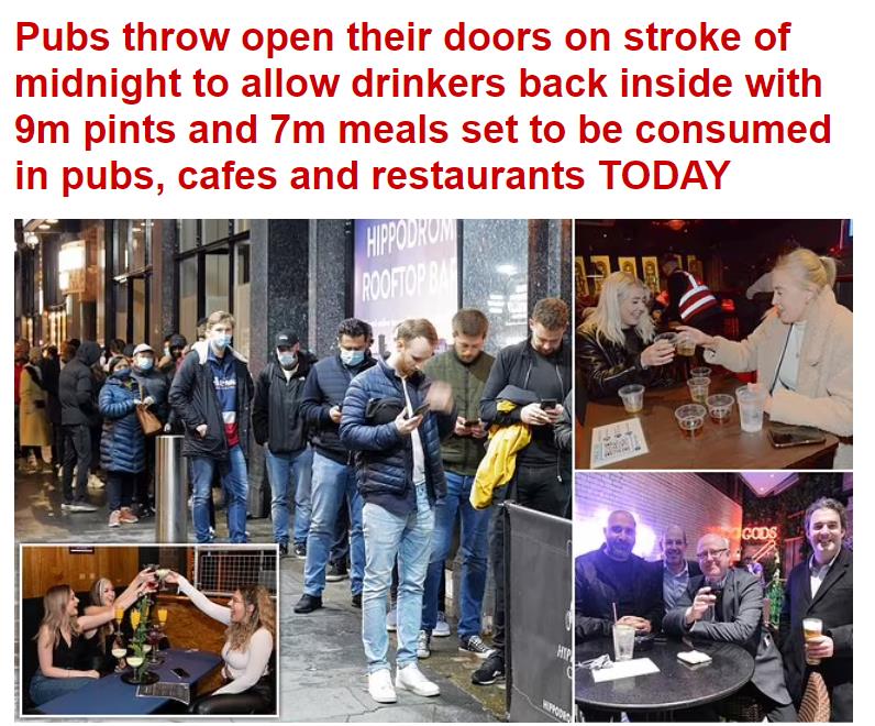 而据一些专家表示,庆祝解封的英国人今天将消耗掉900万品脱的啤酒,吃掉700万份大餐。