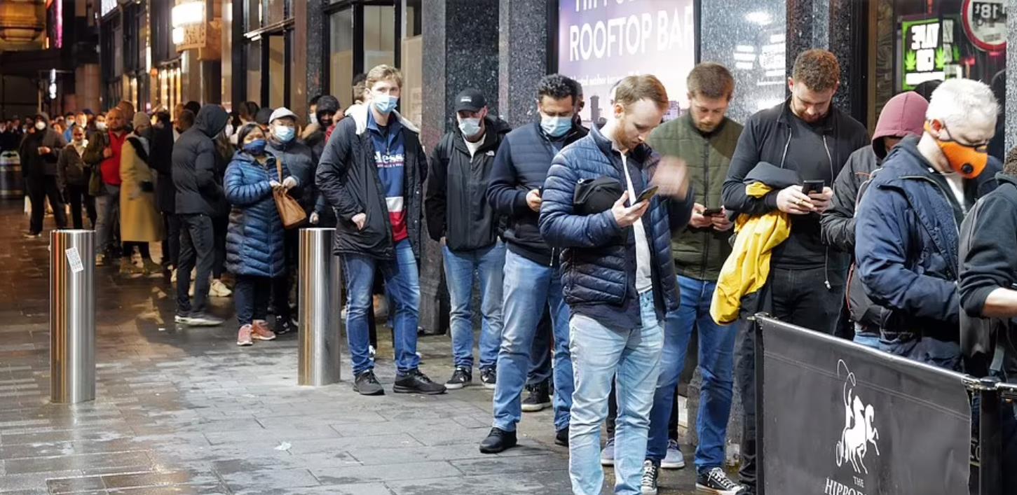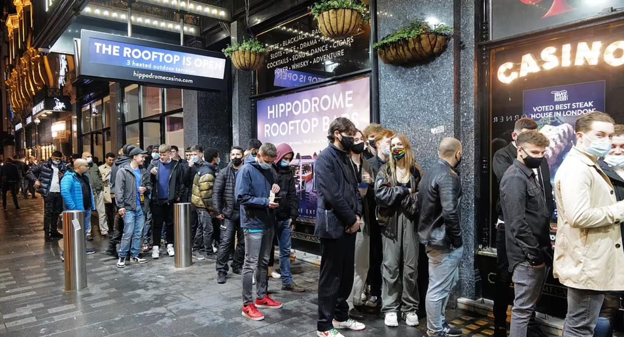 位于莱斯特广场的竞技场也排起了长长的队伍,人们都等待着解封后可以放肆玩乐。