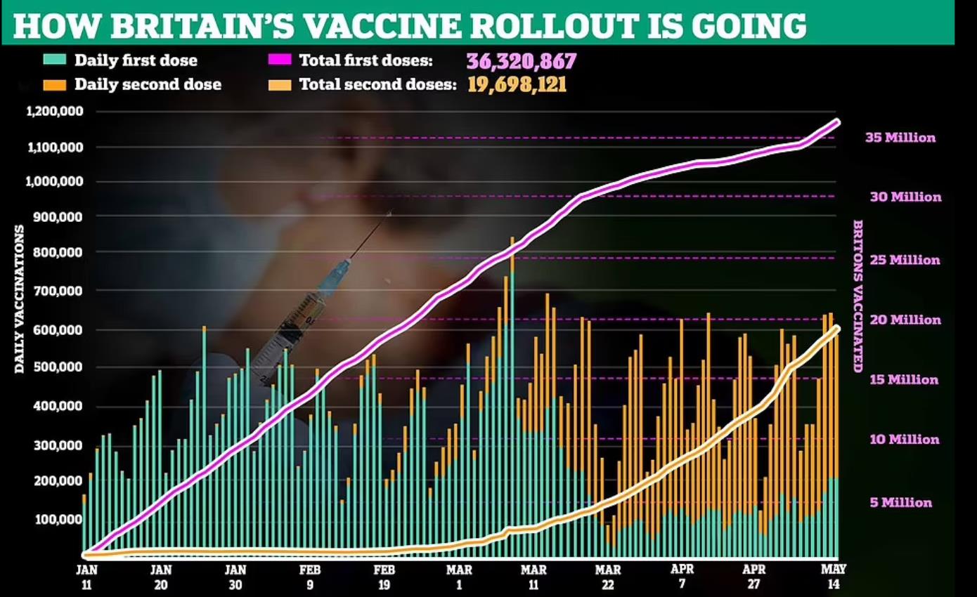 另外,据最新官方数据,英国目前已经有约2,000万人完全接种了疫苗,有超过3,600万人接种了第一剂疫苗。