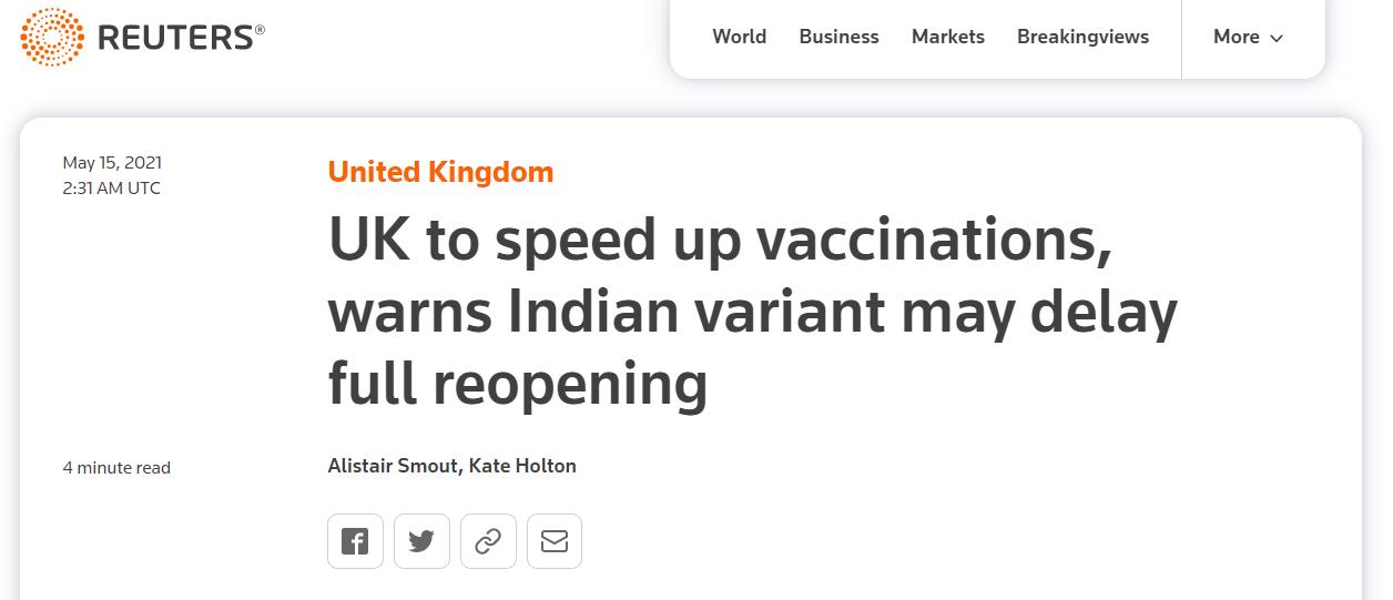 印度变种继续在英传播,科学家们呼吁人们保持高度谨慎,鲍里斯不排除局部封锁以及英国6月21日最终解封的日期推迟…
