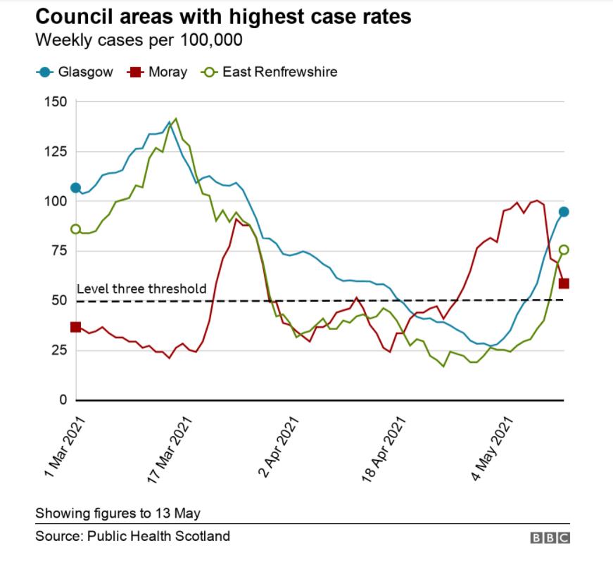 由于苏格兰格拉斯哥( Glasgow)和Moray地区的病例数近期出现了激增,这两个地区暂时不会放宽规定。