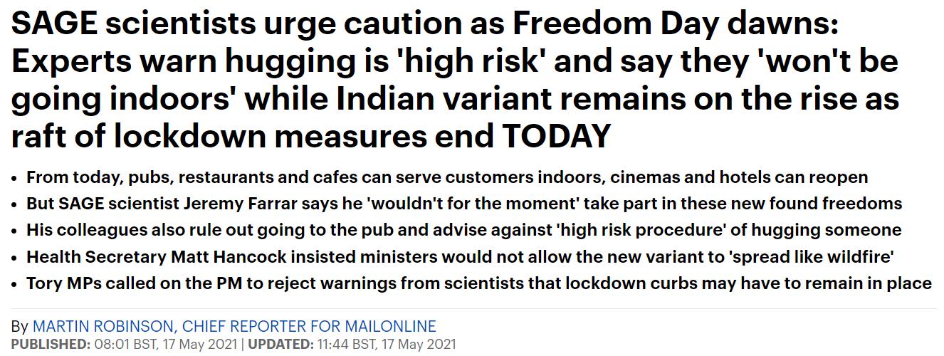 由于印度变种导致的病例的激增,英国多位顶级科学家也认为人们应该继续保持谨慎,并警告称拥抱是“高风险的”,他们并“不会在室内聚会”。