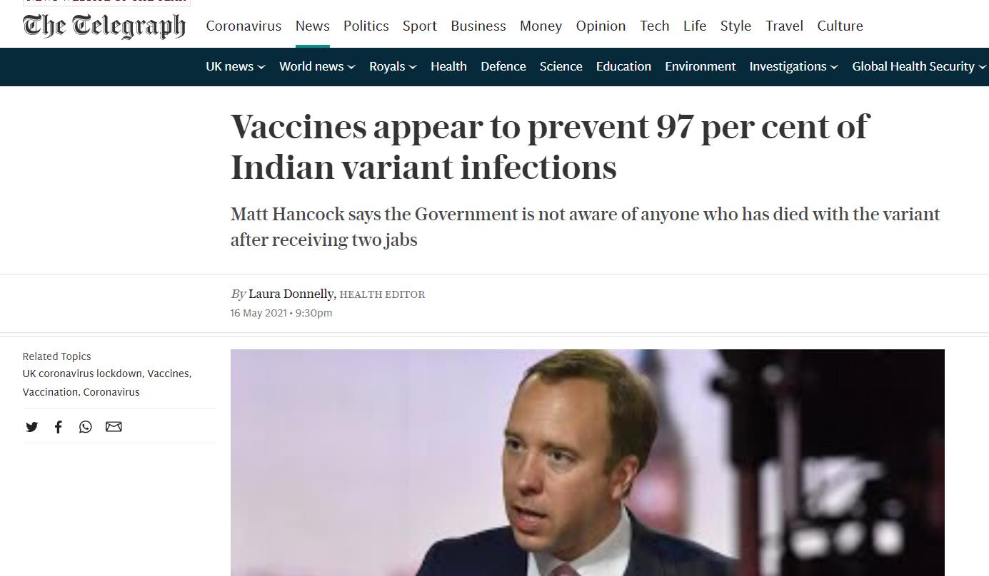 英国卫生部长马特·汉考克也承认,在疫情热点地Bolton医院中,18名印度变种住院患者中,仅有1人完全接种了疫苗。