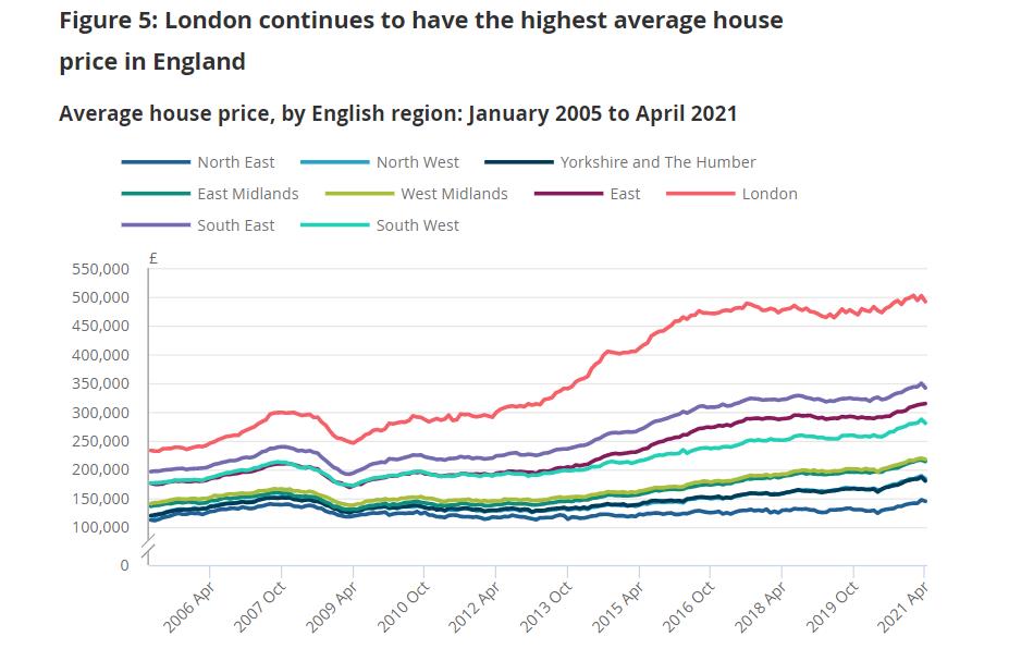 据英国国家统计局(ONS)的数据显示,截至2021年4月,英国平均房价年度上涨了8.9%,升至25万英镑的新高,这是近7年来的最高涨幅。