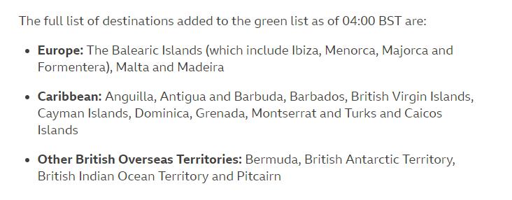 马耳他、马德拉群岛、巴利阿里群岛以及部分英联邦成员国均已被列入英国国际旅行“绿色名单”,游客们从这些地区返回时将不再需要进行自我隔离…