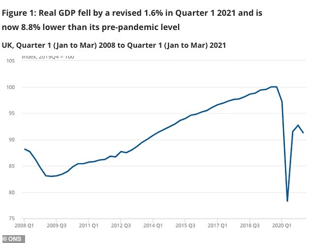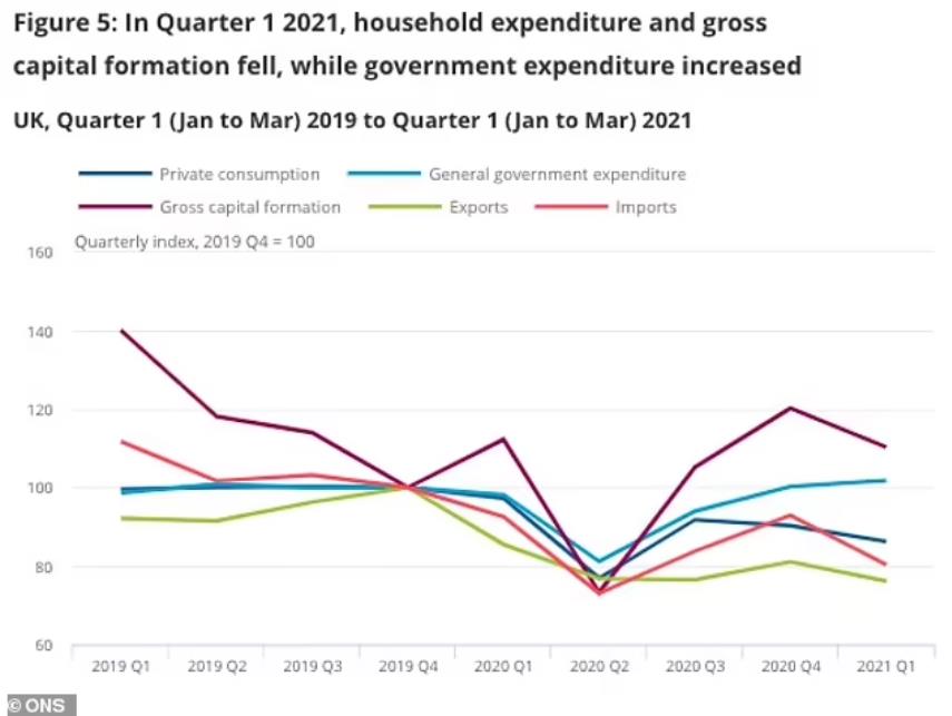 英国国家统计局(ONS)的最新数据显示,受新冠疫情影响,英国国内生产总值(GDP)在2021年第一季度预计下降了1.6%,略高于此前1.5%的预期。