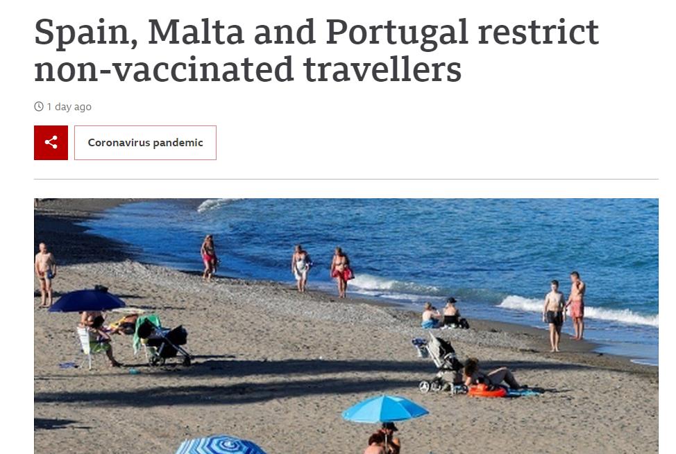 在西班牙,包括前往巴利阿里群岛在内,英国旅客需要证明他们已经接种了两剂疫苗,或者在抵达时提供新冠病毒阴性检测报告。