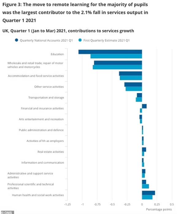 ONS表示,GDP的下降与预期基本一致,主要是由于新冠措施加强导致教育、批发和零售部门收缩引起。其中,学校关闭导致第一季度的教育产出更是下降了14.7%。
