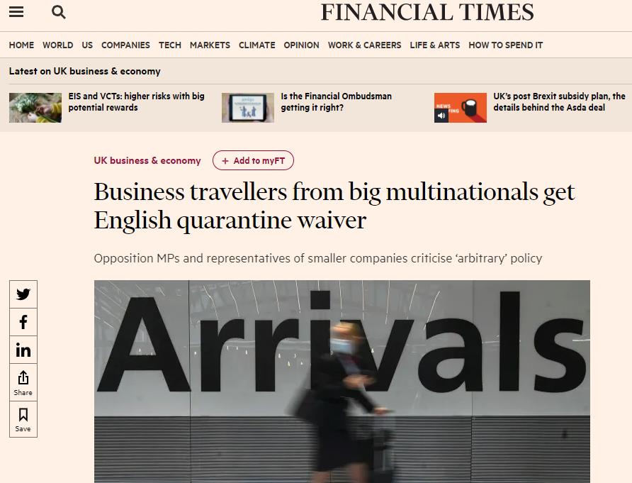 根据英国政府本周二出台的规定,如果大型跨国公司高管的访英旅行被认为带来了显著的经济效益,那么他们入境就无需自我隔离。