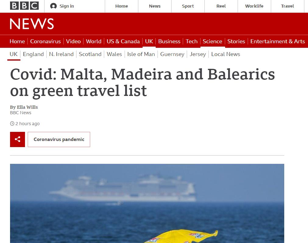 据媒体报道,马耳他、马德拉群岛和巴利阿里群岛已被列入英国国际旅行“绿色名单”。