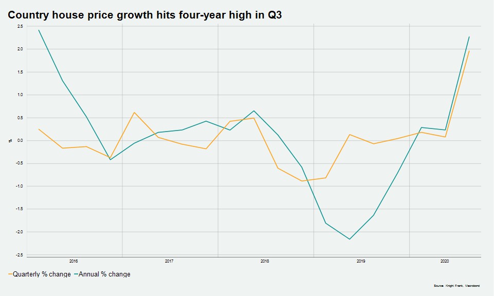 同样来自Knight Frank的数据显示,疫情期间乡村住宅价格扭转颓势,在去年第三季度,主要乡村住宅房价年度上涨了2%,9月份的同比涨幅达到2.3%。