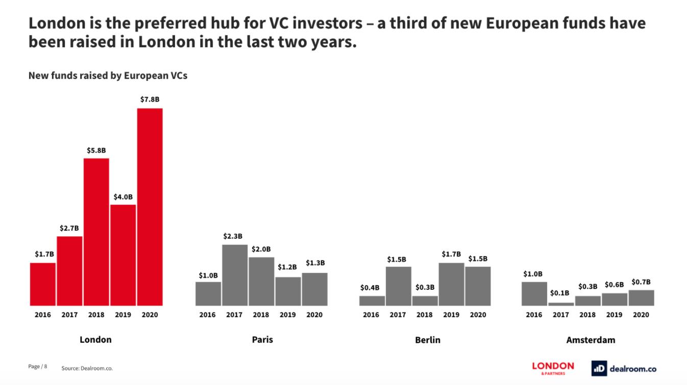 数据还显示,伦敦风投公司在2020年筹集了78亿美元的新基金,占过去两年欧洲所有新筹集的风投基金的三分之一。
