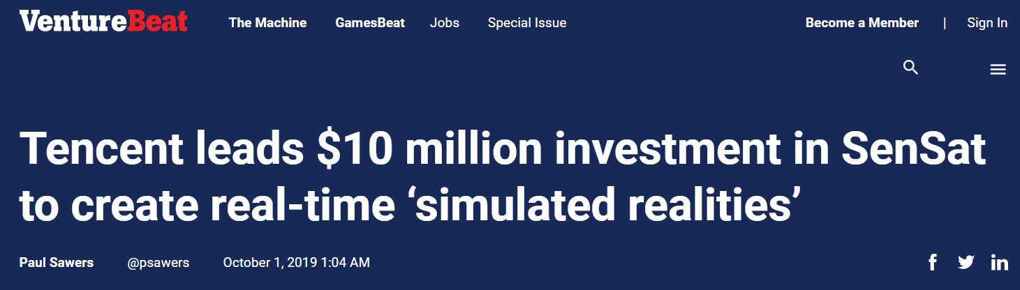 2019年第四季度,腾讯又双叒牵头完成了对英国人工智能公司SenSat的A轮投资,总投资额高达1,000万美元。