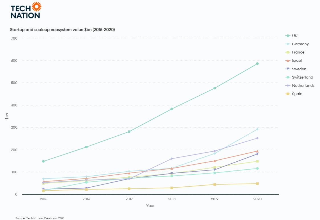 目前,英国也被视为全球最有价值的科技生态系统之一,科技初创企业和规模化生态系统的估值为5,850亿美元,比2017年高出120%,是排名第二的德国(2,910亿美元)的两倍多。
