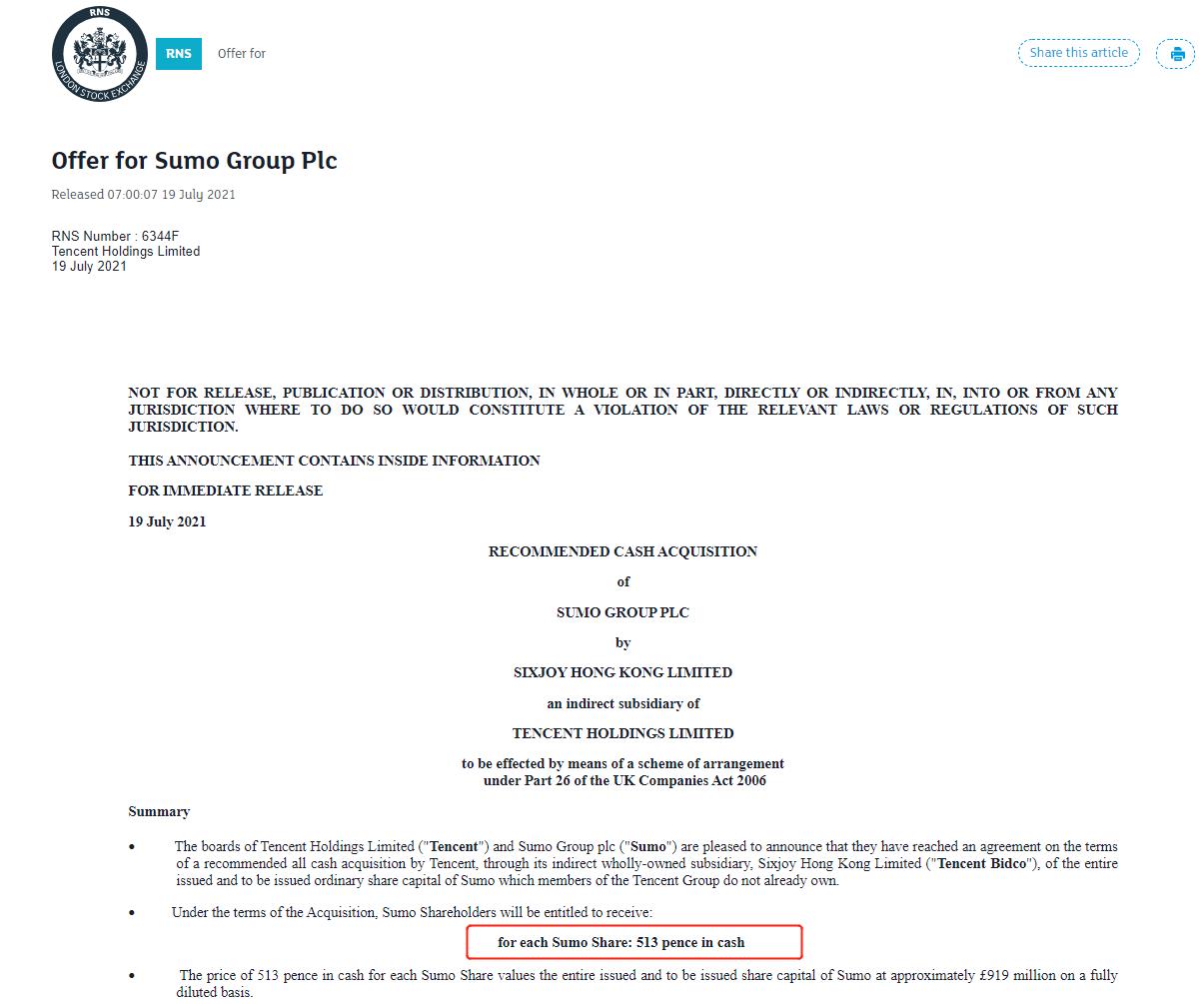 随后,已在伦交所上市的Sumo也披露了这一信息,宣称同意腾讯控股旗下全资子公司Sixjoy以纯现金方式对Sumo实现全额收购,收购价为每股513便士。