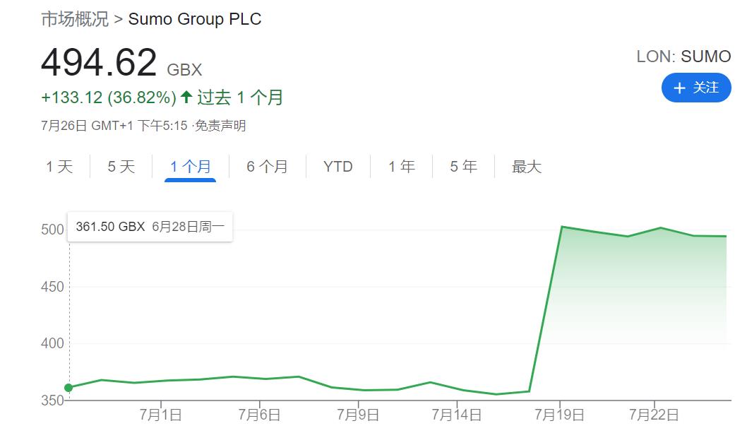 在这一消息公布后,Sumo的股价也出现了猛涨,达到了近期以来的高位。